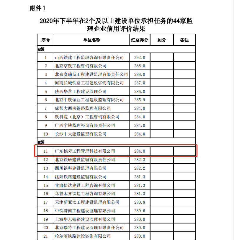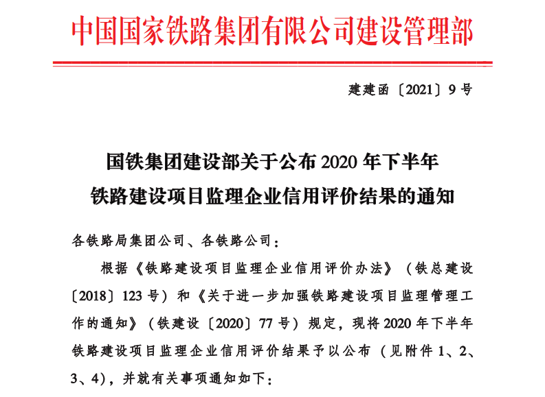 近日,国铁集团建设部公布了2020年下半年在2个及以上建设单位承担任务的44家监理企业信用评价结果,公司被评为B级第一名。