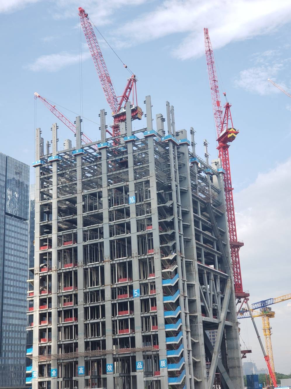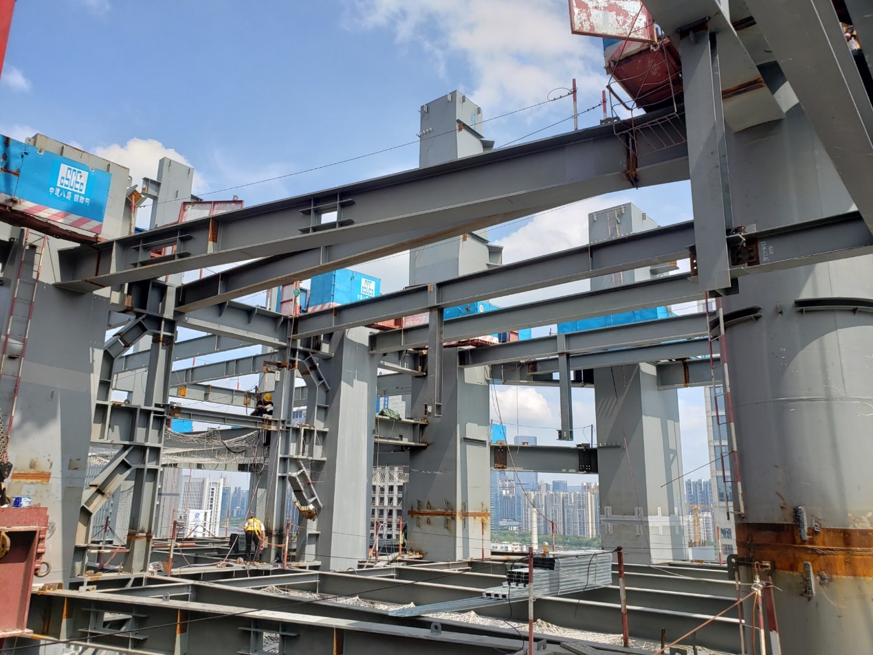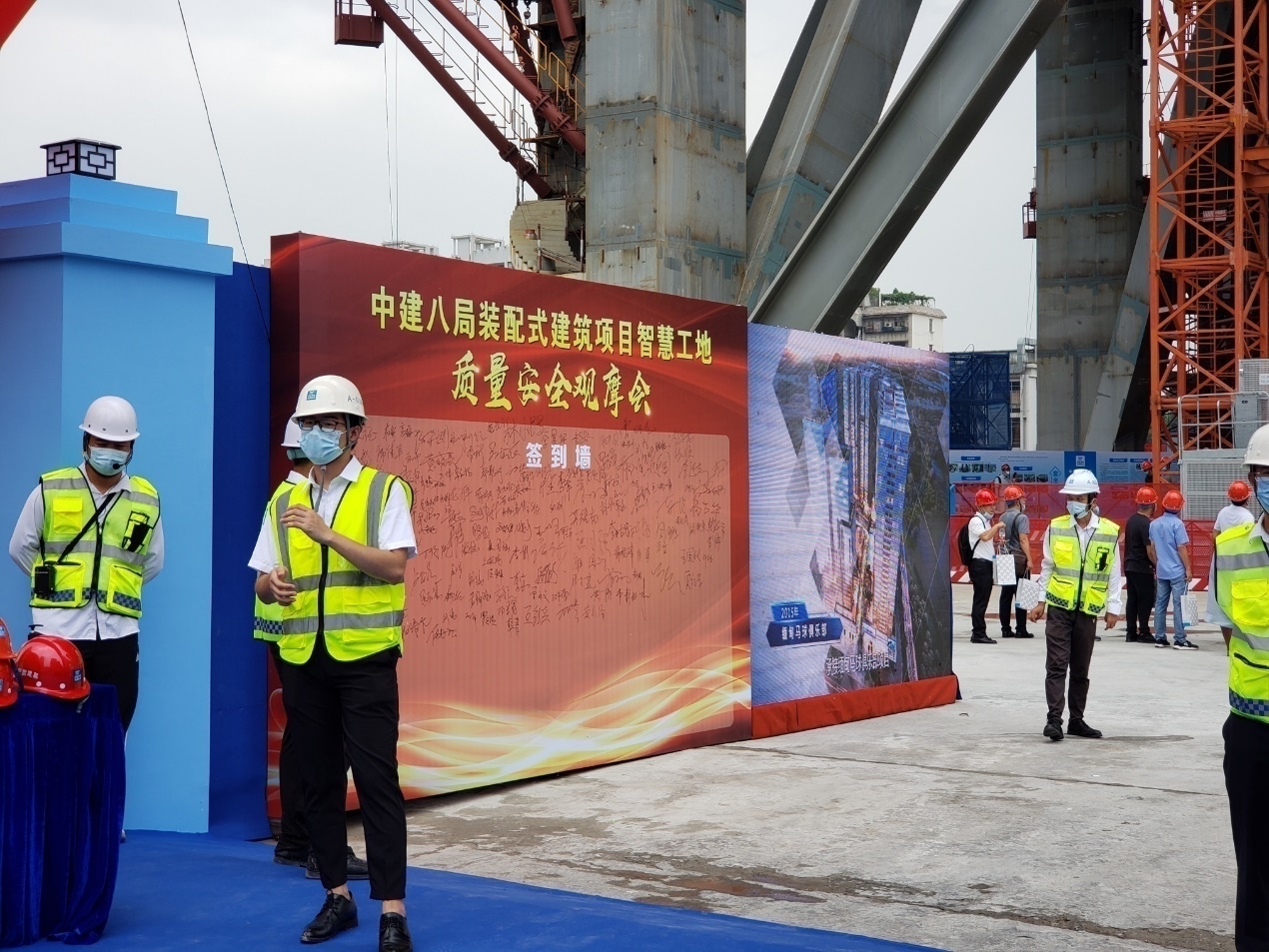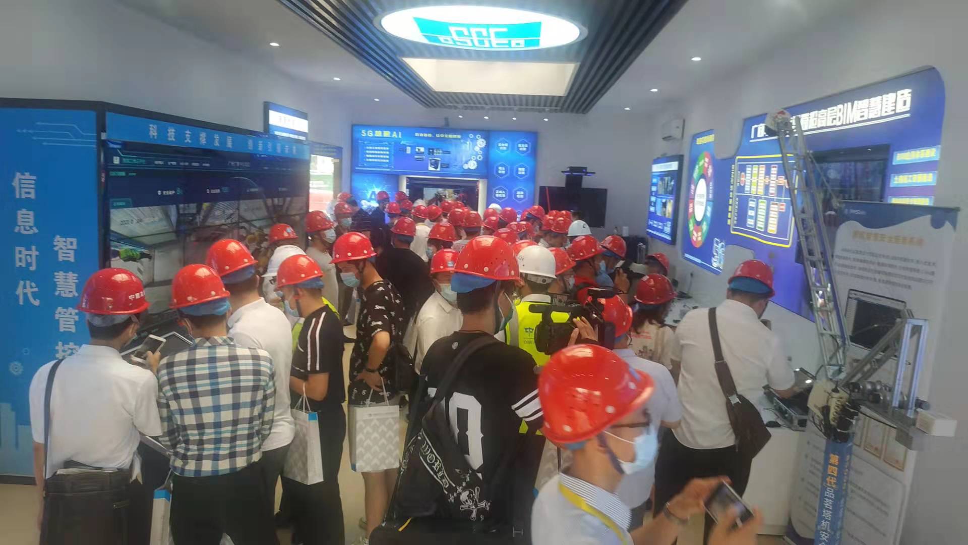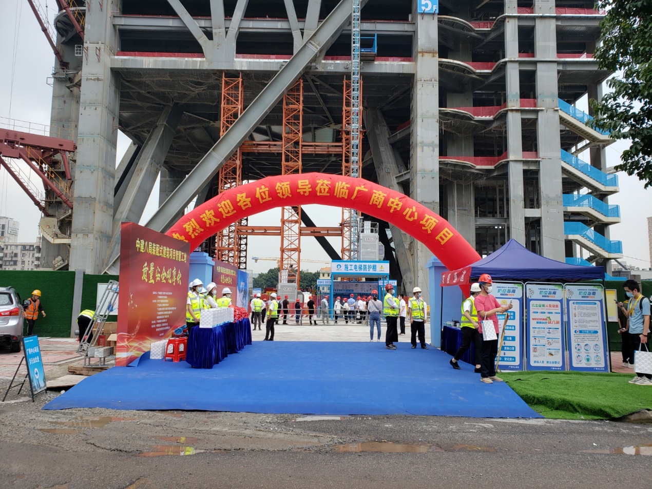 广商中心项目于2021年8月4日上午成功举办“装配式建筑项目智慧工地质量安全观摩会”总计接待协会人员以及行业内人士约260人。观摩开始,参会人员从2号大门进入,由项目迎宾人员引导,在欢迎喷绘墙上签字并合影留念。随后按照观摩线路先后参观了党建文化长廊、项目砌体以及抹灰质量样板,腻子与防火涂料样板、5G智慧工地展示中心、塔吊吊钩可视化、云平台指挥中心、智能鹰眼安全巡视、5层楼板磨光拉毛施工工艺实体样板、钢结构格构柱支撑工艺、巨柱与圆管柱加工工艺、焊接机器人现场演示,动臂塔吊独特外挂支撑体系设计与爬升工艺、施工电梯安全管理系统与施工电梯AR人数识别技术等施工技术以及智慧工地应用实例。广商中心项目纯钢结构装配式建筑特点以及智慧工地打造情况得到了前来观摩的协会专家以及业内人士的一致认可及好评!随后,参会人员还参观了第十届广东新型建筑工业化与装配式建筑展览会暨建设工程技术设备博览会,参观了2021广东智慧工地及绿色安全施工论坛,本次观摩会的顺利圆满成功,向社会展示了广商中心优秀的建设与管理水平,为协会推广装配式建筑及智慧工地标杆项目,加快建筑行业转型升级做出重要贡献。