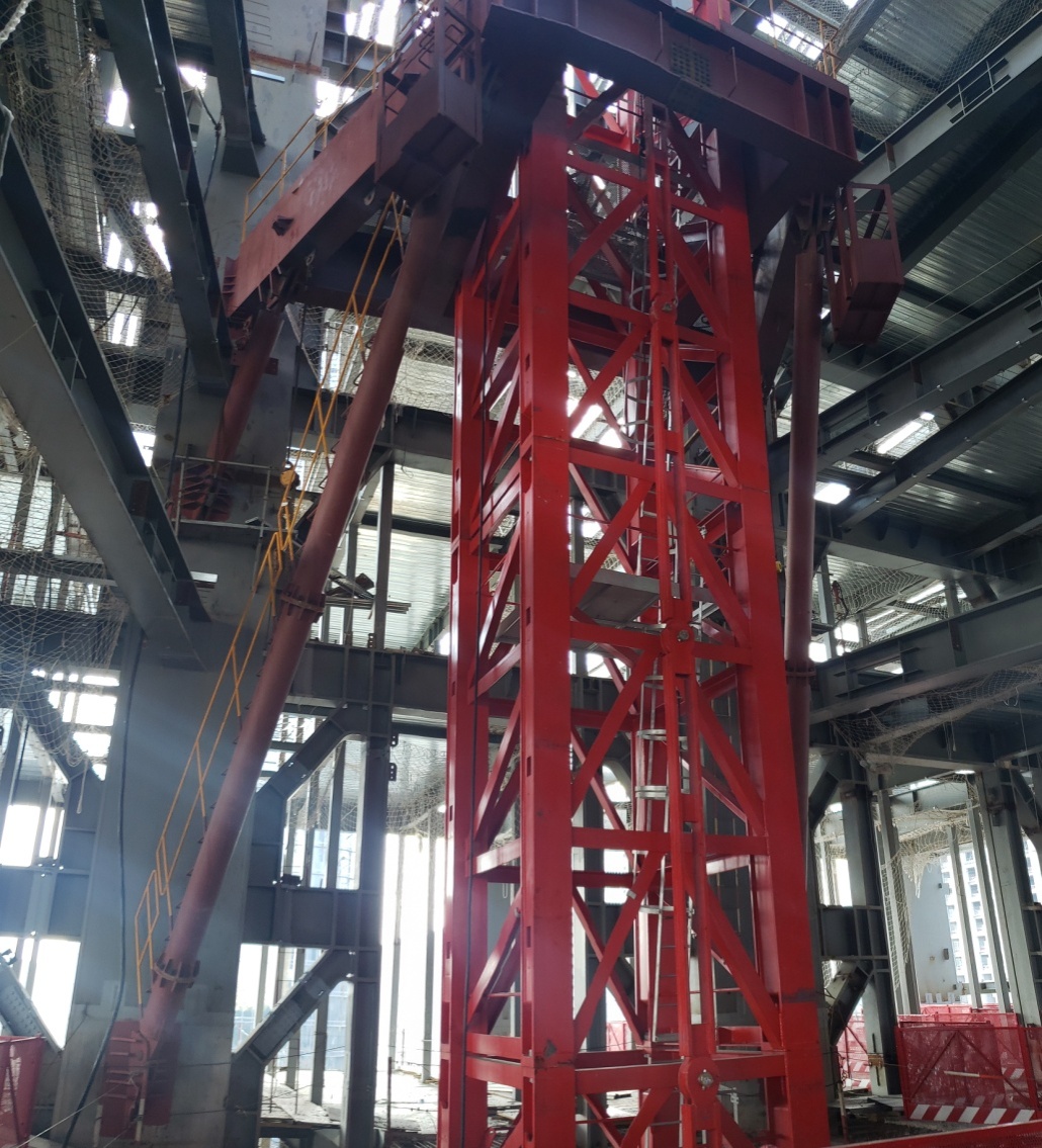 地上施工阶段采用1台STL1460C塔吊(最大吊重64T,臂长50米)2台ZSL850塔吊(最大吊重50T,臂长50米)作为钢构件及建筑材料的垂直运输设备。这三台塔吊也成为全国首例纯钢结构塔吊附着爬升设计,基于纯钢结构支撑体系的特点,本项目设计出一种采用四根下斜支撑的新型塔吊支撑架结构。