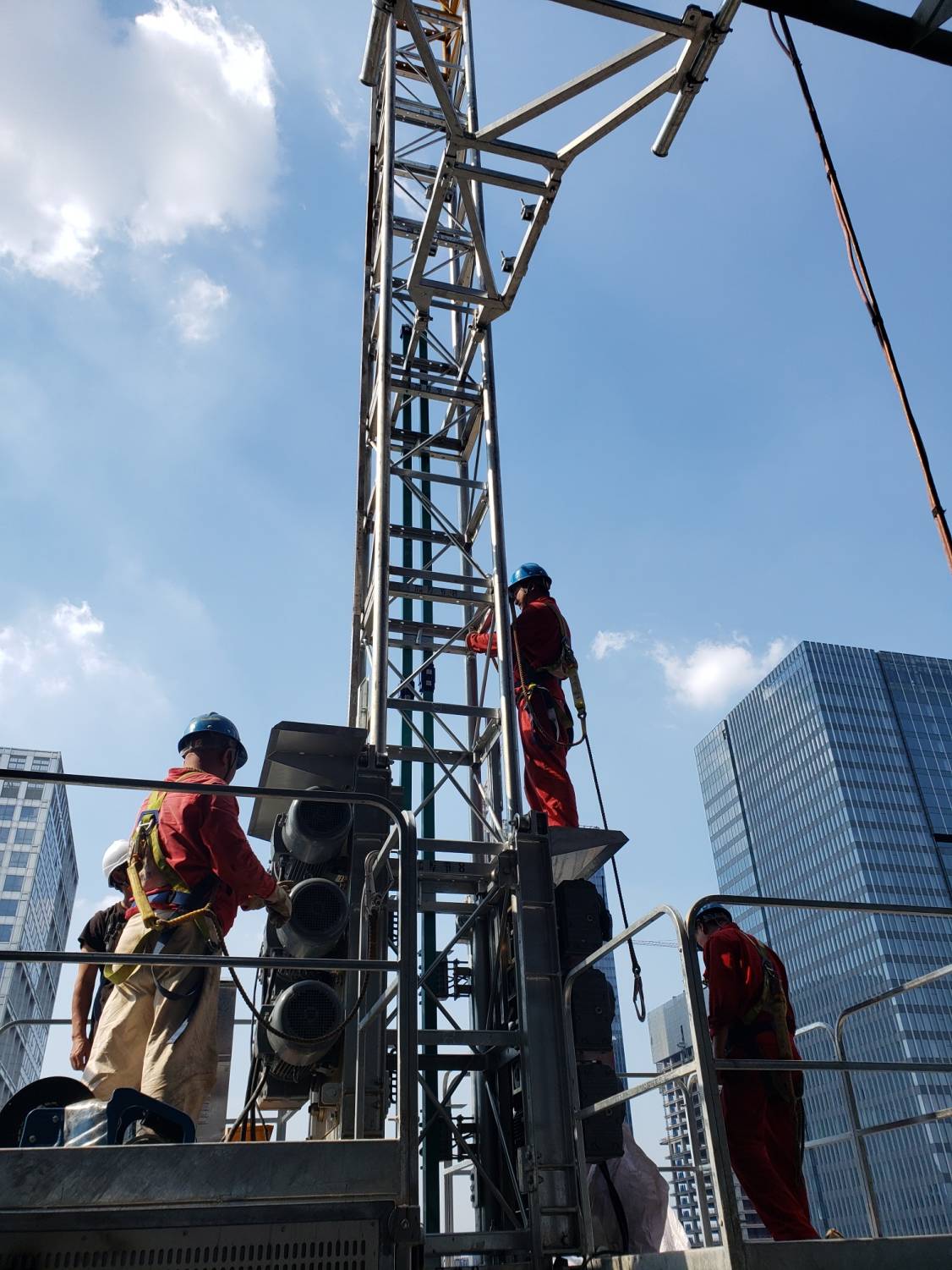 采用高立3组SC200/200GS型施工升降机,该升降机采用非传统(非随行电缆供电,避免了升降机在运行期间供电电缆纠缠在一起而严重影响安全的隐患)滑触线供电。